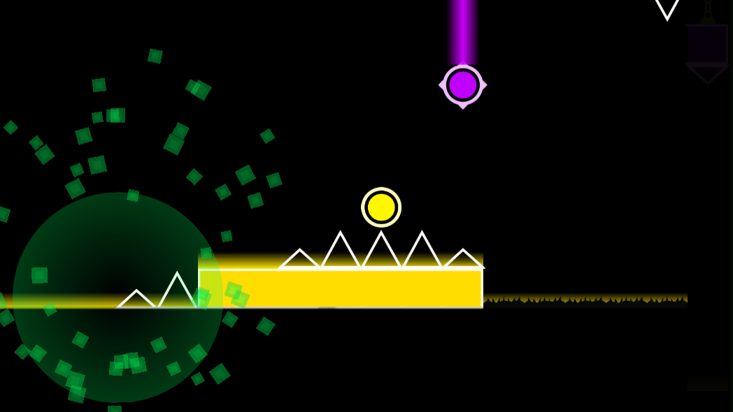 Players maneuver a cube across neon geometric obstacles that are colored and flashingly lit. An environment that is lively and energizing is created by ambient lighting and energetic electronic music. Colored sparks explode in time with the music as the cube bounces over spikes and other obstacles to the beat.